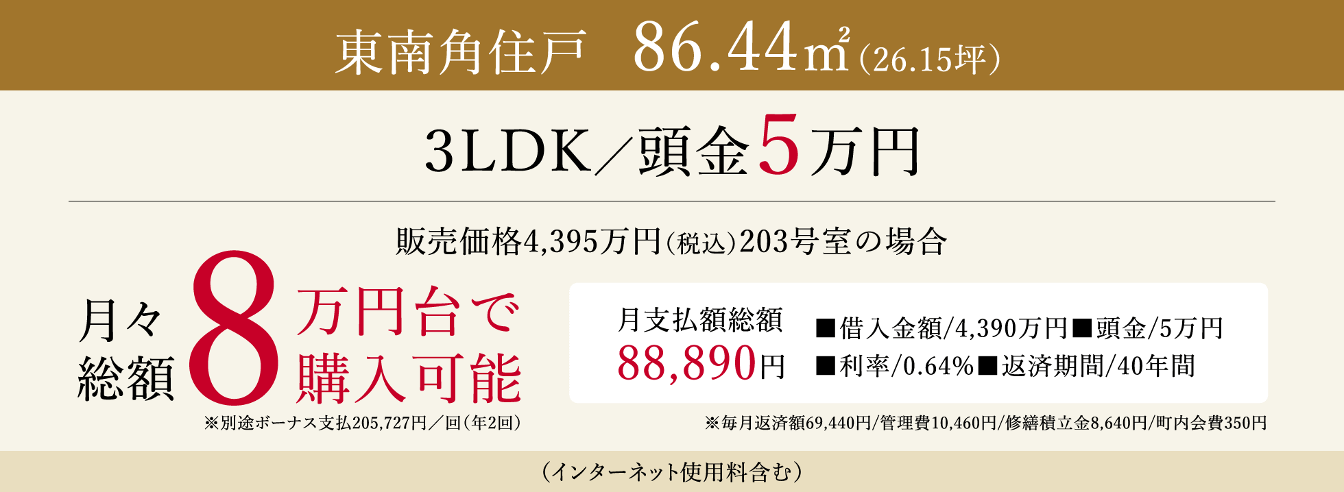 ●提携金融機関/りそな銀行 ●借入申込資格/○借入時年齢20歳以上70歳未満で、最終ご返済時が満80歳未満のお客様○前年の税込年収が100万円以上のお客様○安定した収入が継続して得られる職業・業種の給与取得者で現在の勤続年数が1年以上あるお客様○勤続、営業年数が3年以上の国民健康保険の被保険者である給与所得者、自営業者、会社役員およびこれらに準ずるお客様○過去にローンの延滞、不渡りなどの信用事故のないお客様○団体信用生命保険に加入できるお客様○取扱店の営業区域内に居住または勤務し、担保物件が当時の営業区域内にあるお客様●融資限度額/50万円以上3億円以内(1万円単位)●融資期間/1年以上40年以内(1年単位)●利率/年利0.64%(変動金利・店頭表示金利より、優遇金利2.235適用後)・元利均等返済・40年返済※金利引き上げの適用には所定の審査があります。●事務手数料/借入金額の2.2%(消費税等込)●保証料/不要※提携ローンは一定要件該当者が対象です。上記提携ローンの金利・借入条件は2025年12月1日適用のものであり、今後変更が生じる場合がございます。 ※適用される金利は融資実行時のものとなり、表示されている金利と異なる場合がございます。※掲載の返済例は概算です。実際の返済額と異なる場合がございます。審査の結果によっては、融資のお申し込みをお断りする場合や融資金額に限度がある場合がございます。予めご了承ください。※上記のお支払い以外に初期費用および管理費・修繕積立金等が必要となります。※別途、火災保険加入料が必要となります。詳しくは係員にお尋ねください。