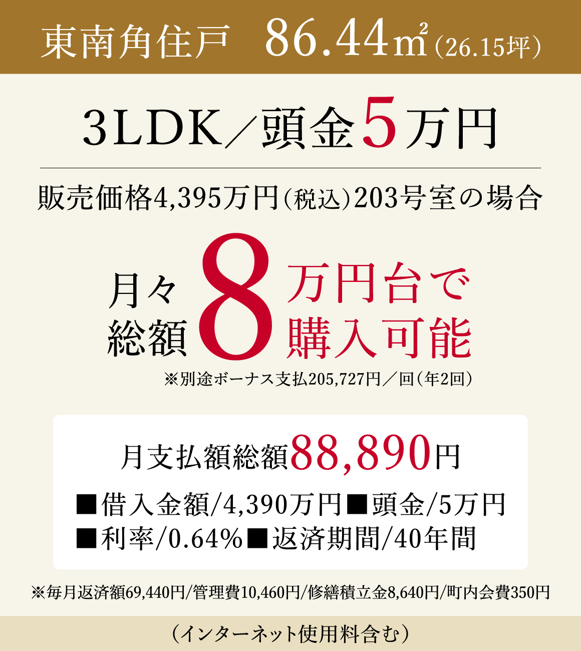 ●提携金融機関/りそな銀行 ●借入申込資格/○借入時年齢20歳以上70歳未満で、最終ご返済時が満80歳未満のお客様○前年の税込年収が100万円以上のお客様○安定した収入が継続して得られる職業・業種の給与取得者で現在の勤続年数が1年以上あるお客様○勤続、営業年数が3年以上の国民健康保険の被保険者である給与所得者、自営業者、会社役員およびこれらに準ずるお客様○過去にローンの延滞、不渡りなどの信用事故のないお客様○団体信用生命保険に加入できるお客様○取扱店の営業区域内に居住または勤務し、担保物件が当時の営業区域内にあるお客様●融資限度額/50万円以上3億円以内(1万円単位)●融資期間/1年以上40年以内(1年単位)●利率/年利0.64%(変動金利・店頭表示金利より、優遇金利2.235適用後)・元利均等返済・40年返済※金利引き上げの適用には所定の審査があります。●事務手数料/借入金額の2.2%(消費税等込)●保証料/不要※提携ローンは一定要件該当者が対象です。上記提携ローンの金利・借入条件は2025年12月1日適用のものであり、今後変更が生じる場合がございます。 ※適用される金利は融資実行時のものとなり、表示されている金利と異なる場合がございます。※掲載の返済例は概算です。実際の返済額と異なる場合がございます。審査の結果によっては、融資のお申し込みをお断りする場合や融資金額に限度がある場合がございます。予めご了承ください。※上記のお支払い以外に初期費用および管理費・修繕積立金等が必要となります。※別途、火災保険加入料が必要となります。詳しくは係員にお尋ねください。
